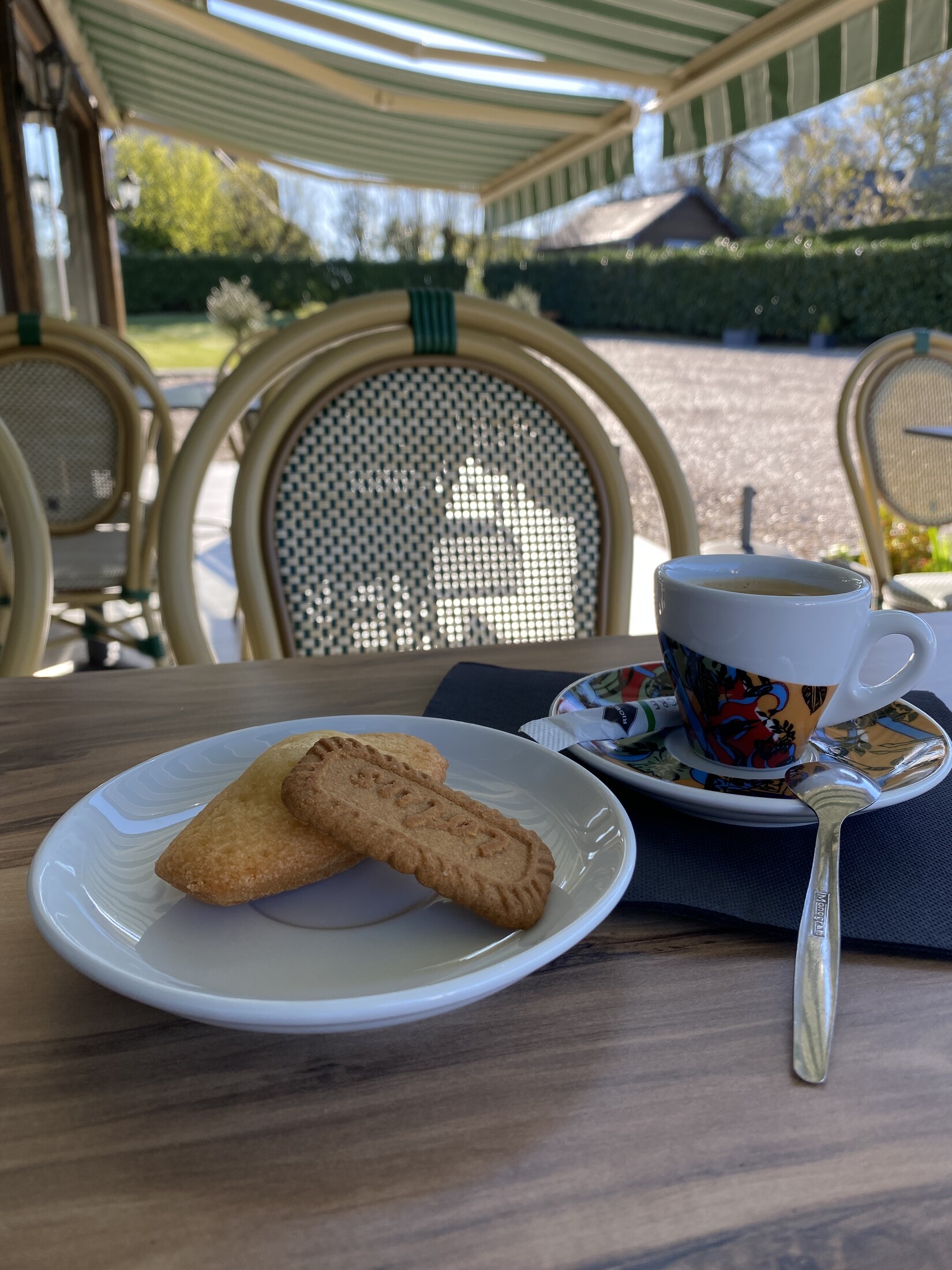 Pause café après un déjeuner sur la terrasse ensoleillée du restaurant.